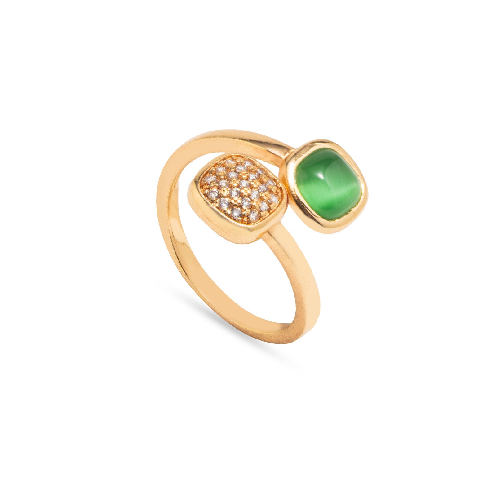 Anello placcato oro 18kt collezione Your Aura – Bronze anello doppio con mini quarzo colorazione Verde e pietra quadrata ricoperta da zirconi colorazione Bianco, creato a mano nei laboratori BLIND LAB da esperti artigiani orafi