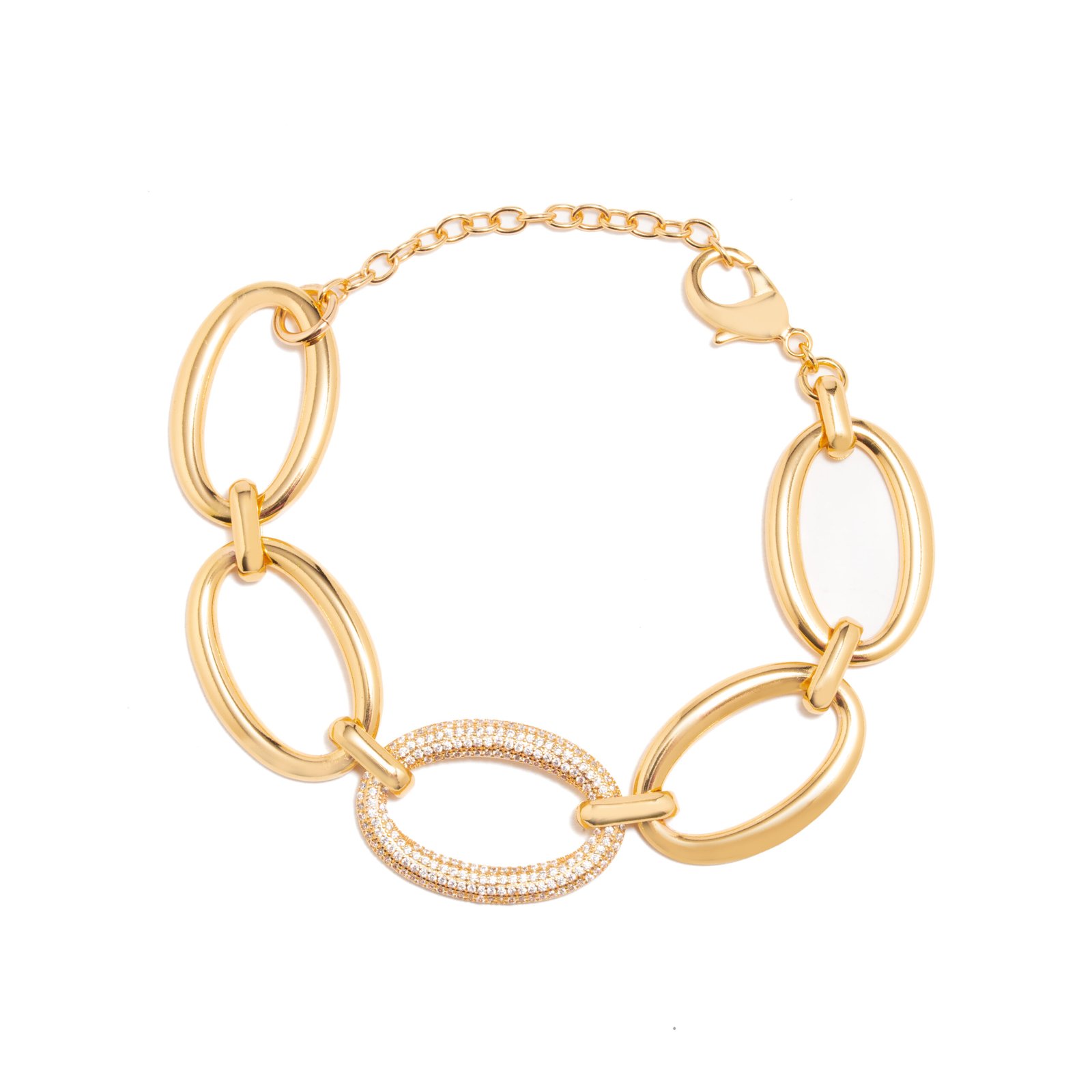 Bracciale placcato oro 18kt collezione Your Aura – Bronze con fantasia maglie ovali grandi lucide intrecciate e una maglia ricoperta da pavè di zirconi colorazione Bianco, creato a mano nei laboratori BLIND LAB da esperti artigiani orafi