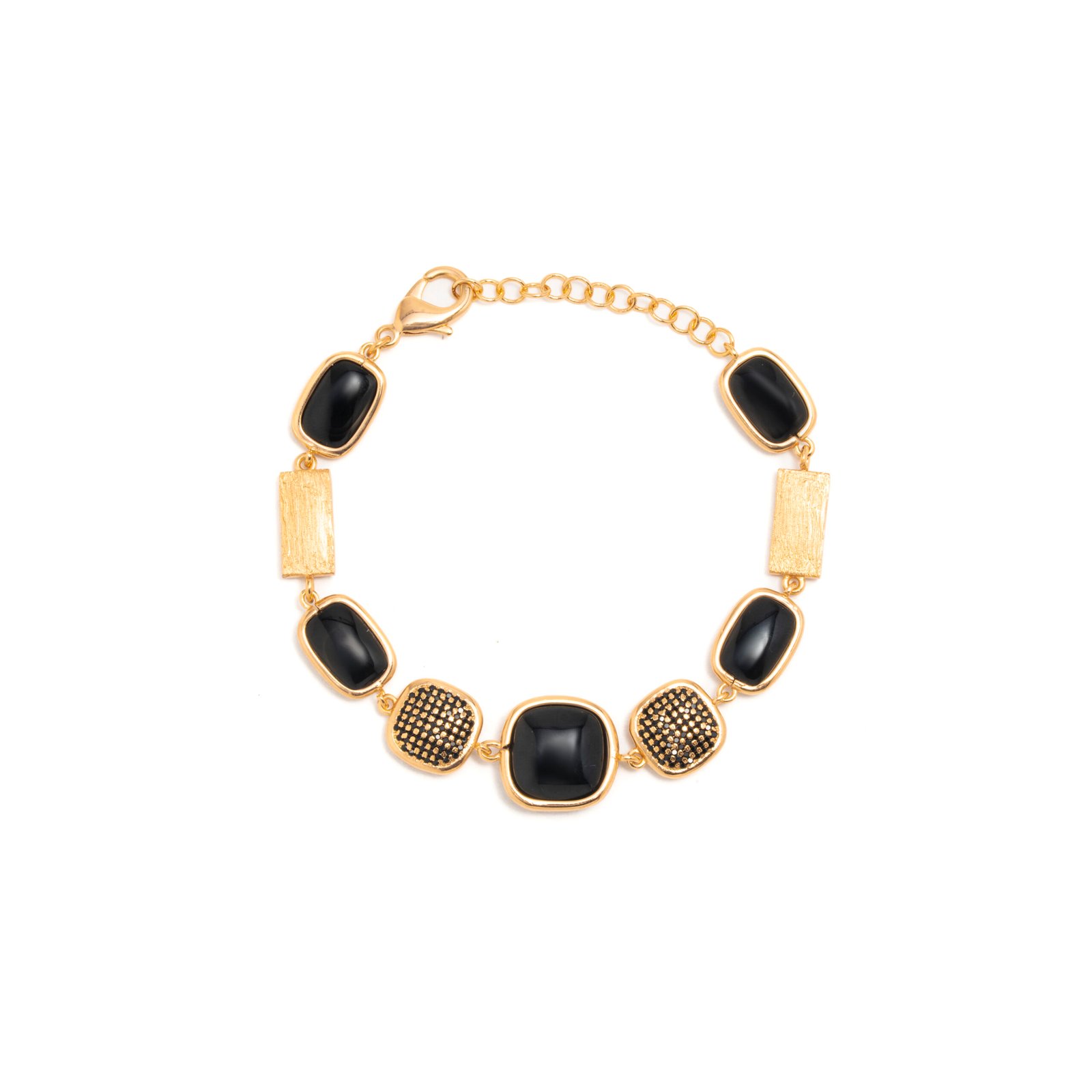 Bracciale placcato oro 18kt collezione Your Aura – Bronze con fantasia pietra quarzo quadrato, quattro pietre quarzo rettangolari, rettangoli satinati e pietre ricoperte di zirconi colorazione Nera