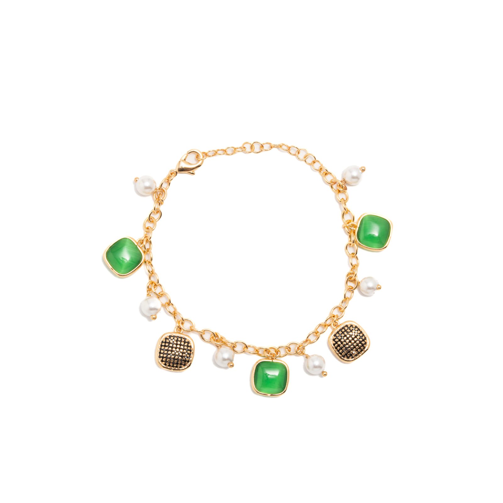Il Charms Glow Green unisce una catena dorata dalla linea essenziale a una danza di charm: pietre verdi dal taglio morbido, micro-pavé luminosi e piccole perle pendenti che aggiungono movimento e delicatezza.