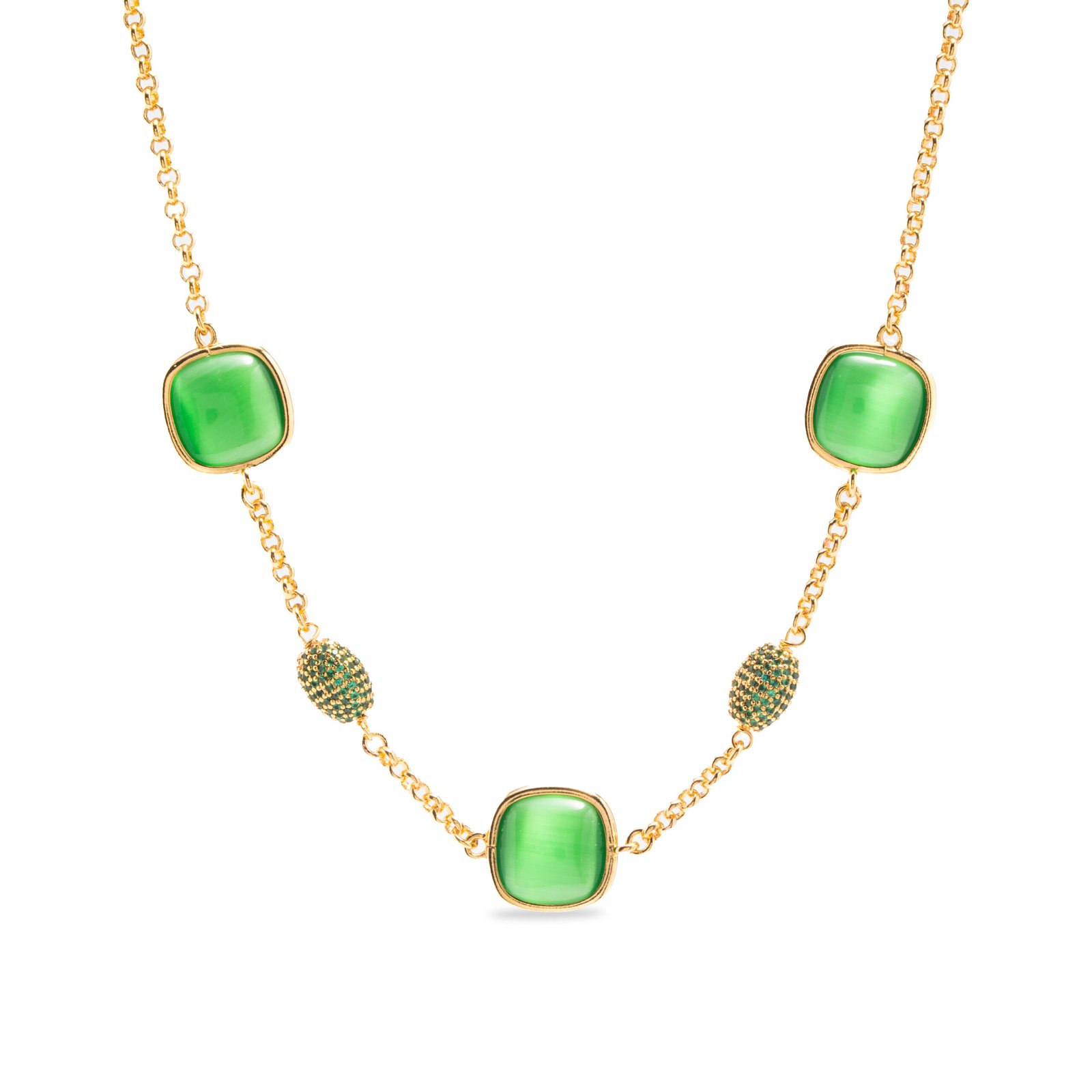 La Collana Aura Gem Green illumina il décolleté con tre cabochon verde brillante, morbidi e satinati, legati da una catena dorata dal profilo essenziale.