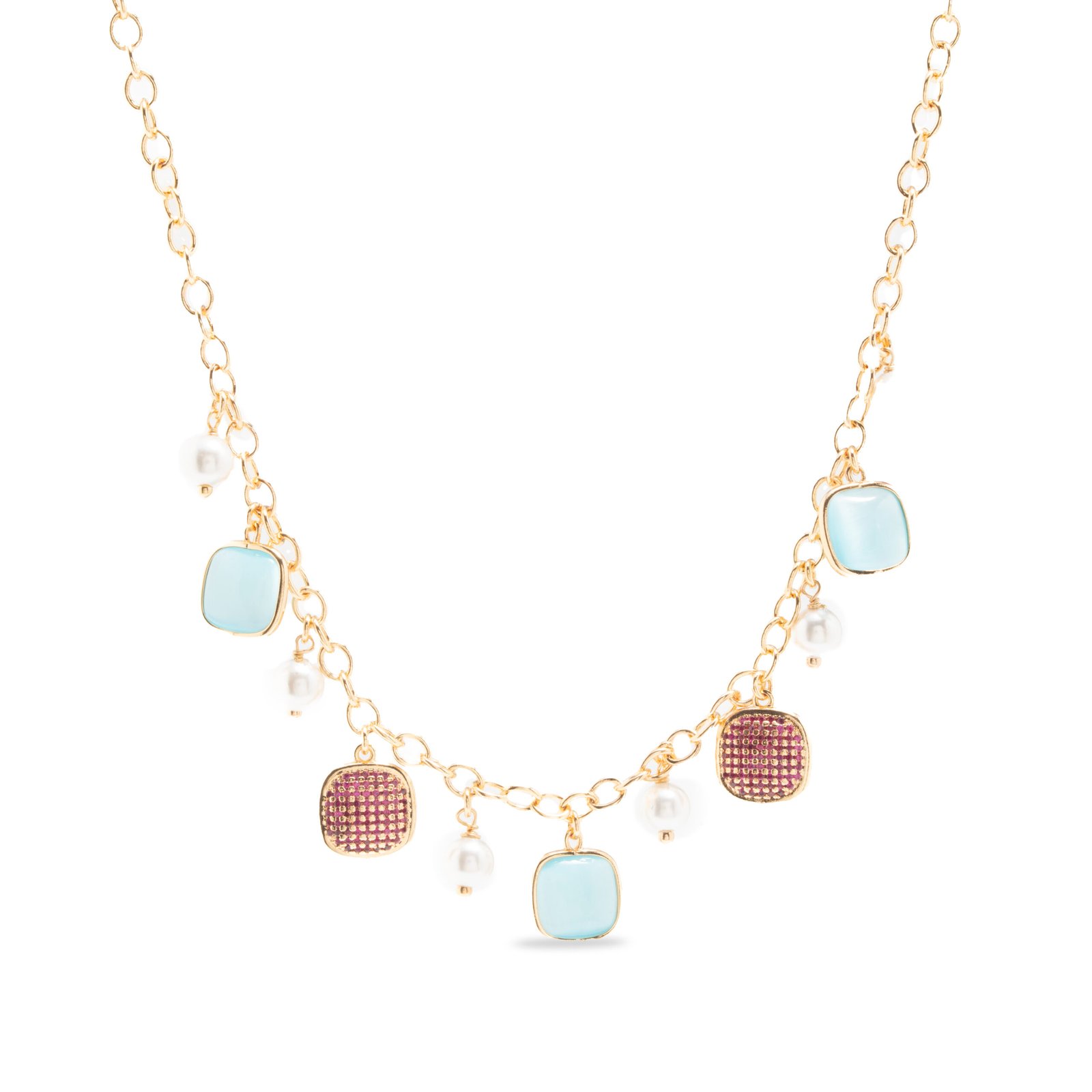 Collana placcata oro 18 kt collezione Your Aura – Bronze con fantasia pietre quarzo quadrate colorazione Celeste, pietre ricoperte da zirconi colorazione Rosso e perle bianche, creata a mano nei laboratori BLIND LAB da esperti artigiani orafi