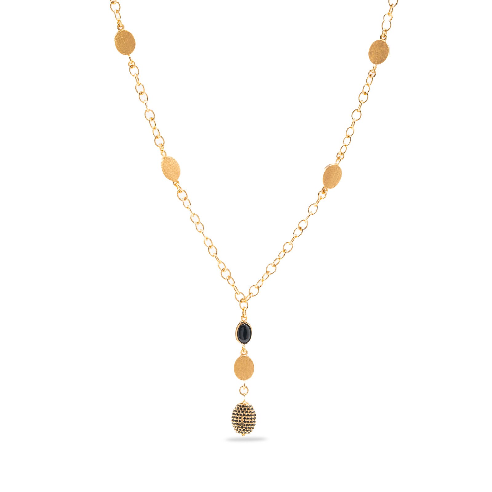 Collana placcata oro 18 kt collezione Your Aura – Bronze con fantasia ciondolo con mini pietra quarzo, pietra ricoperta da zirconi colorazione Nero e ovaline satinate, creata a mano nei laboratori BLIND LAB da esperti artigiani orafi
