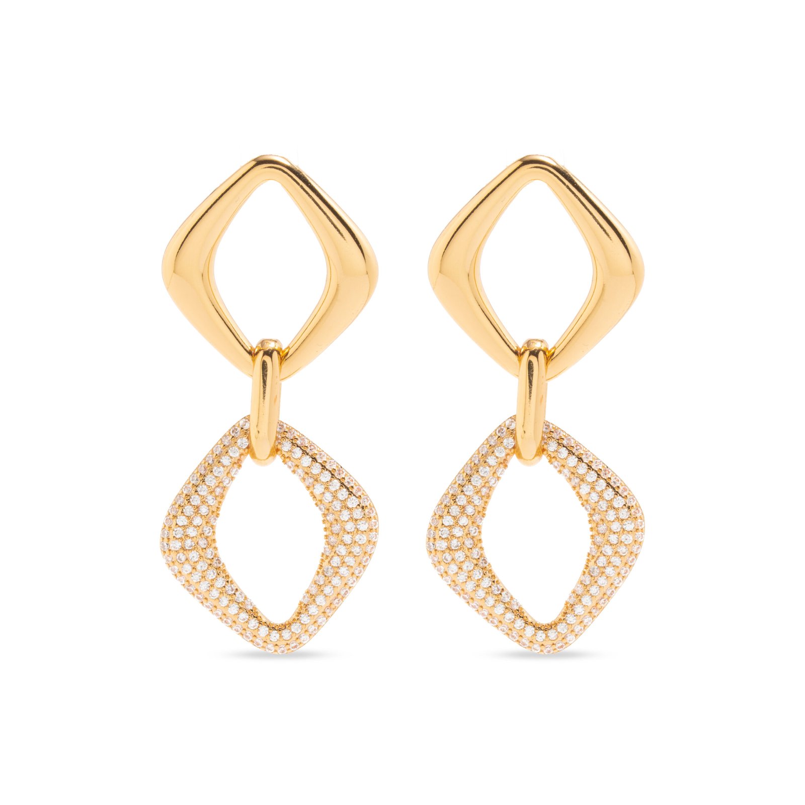 Coppia di Orecchini placcati oro 18kt collezione Your Aura – Bronze rombi uniti, uno liscio e uno ricoperto da zirconi colorazione Bianco, creati a mano nei laboratori BLIND LAB da esperti artigiani orafi