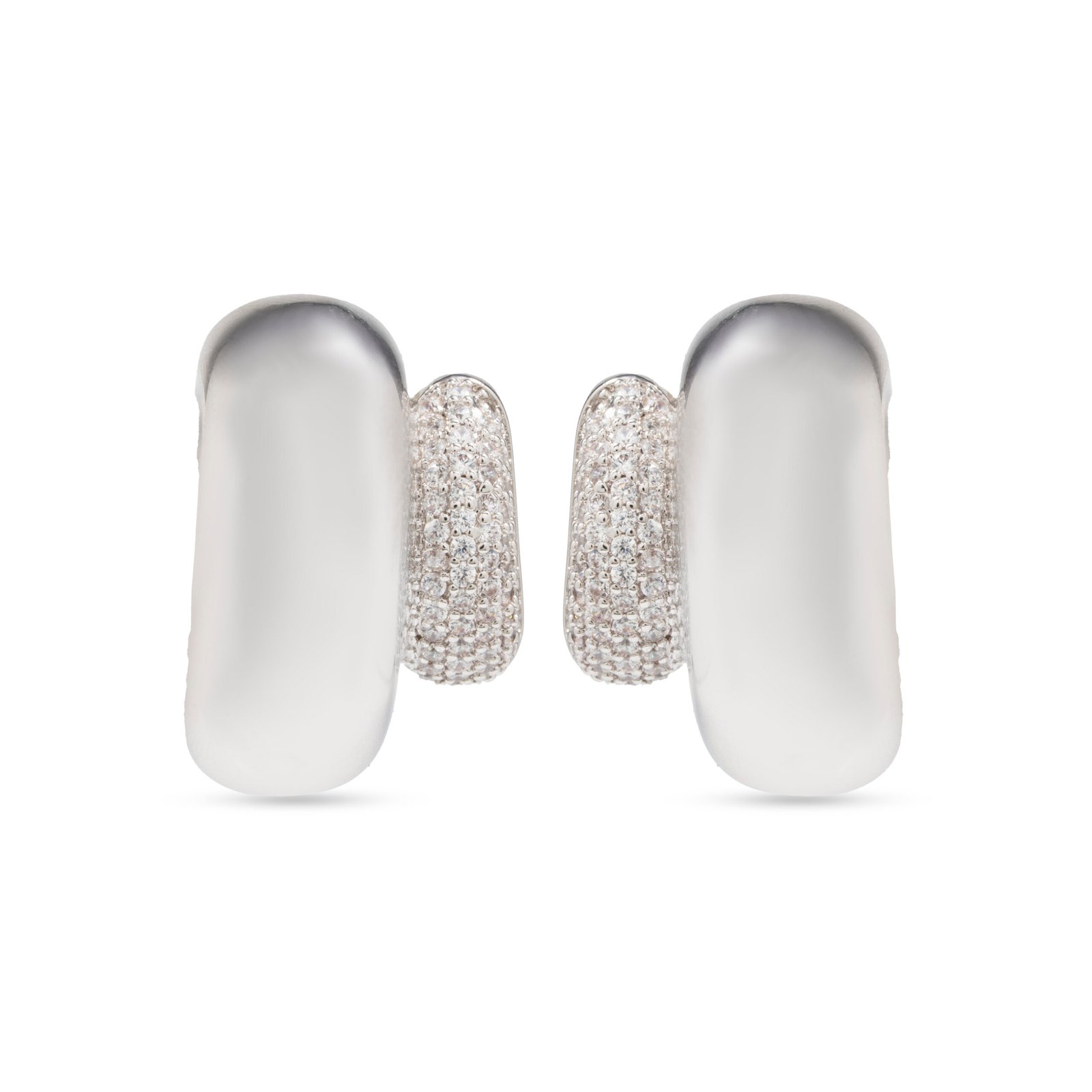 Gli orecchini Pulse Silver giocano con volumi contrastanti: la morbidezza delle curve e la precisione del pavé di cristalli.