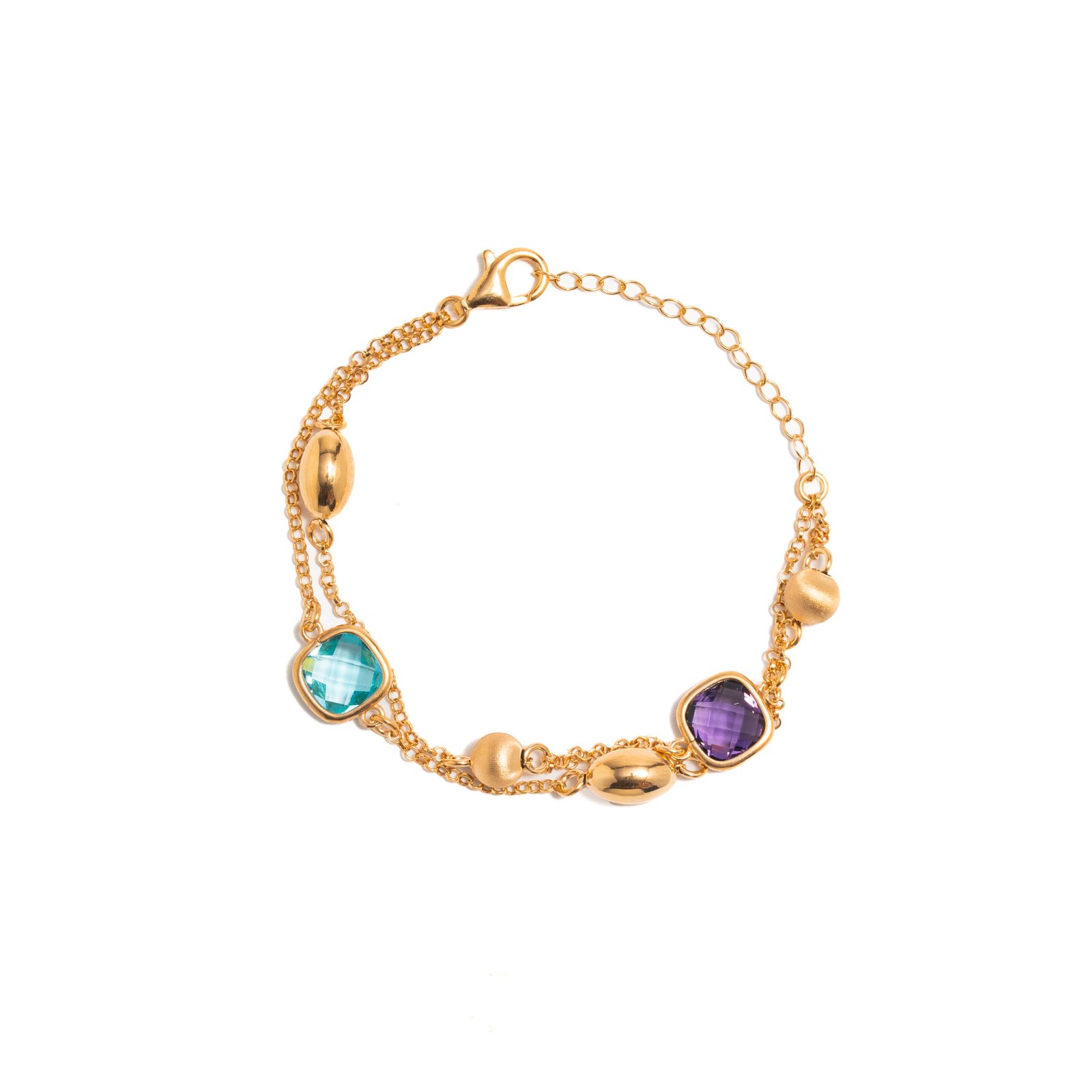 Bracciale in Argento 925 collezione Your Aura – Silver Ag 925 con fantasia doppia catena con doppia pietra cristallo colorazione Viola e Acqua Marina, ovaline lucide e palline satinate in Ag 925 creato a mano nei laboratori BLIND LAB da esperti artigiani orafi
